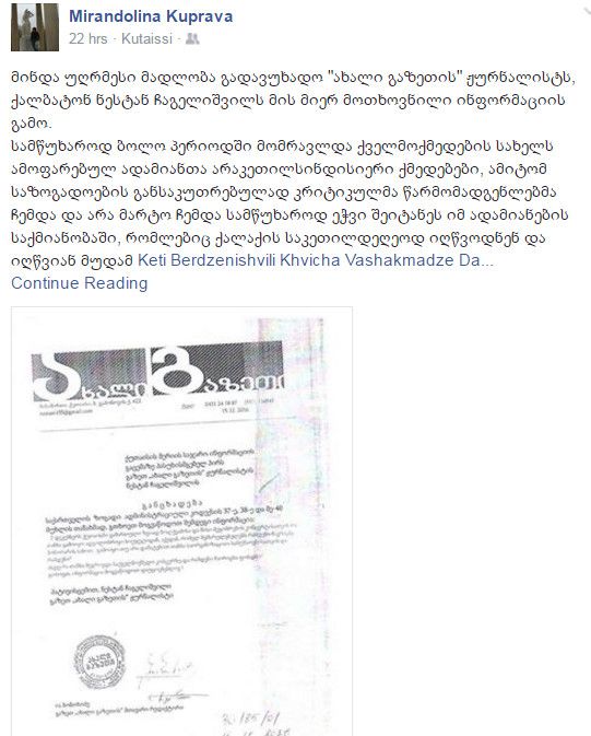 მირანდა კუპრავამ საჯარო სივრცეში განათავსა ასევე ჩვენს მიერ გამოთხოვილი ინფორმაციის პასუხი.