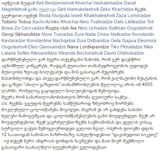 აღნიშნული ინფორმაციით, დასტურდება, რომ კონცერტისთვის ადგილობრივი ბიუჯეტიდან 13 639 ლარი გამოიყო, რისი დიდი ნაწილიც ჰონორარს მოხმარდა.