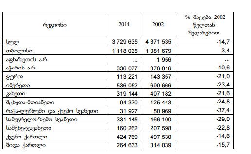 2014 წლის საყოველთაო აღწერის მონაცემებით, საქართველოში 3 713 804 ადამიანი ცხოვრობს. ეს წინა, 2002 წლის აღწერის შედეგთან შედარებით, 15%-ით ნაკლებია.