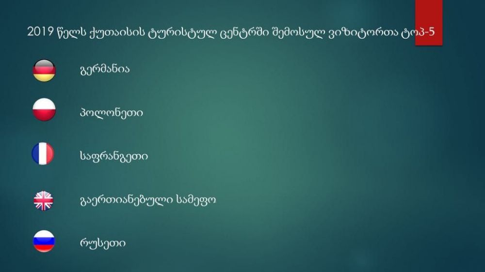 2019 წლის ქუთაისში შემოსული ვიზიტორების ტოპ ხუთეული ასეთია: გერმანია, პოლონეთი, საფრანგეთი, გაერთიანებული სამეფო და რუსეთი.