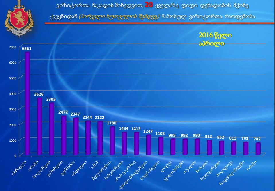2016 წლის აპრილშიც ყველაზე მეტი ვიზიტი კვლავ თურქეთიდან (+12%), აზერბაიჯანიდან (+17,6%), სომხეთიდან (+8,7%), რუსეთიდან (+26,7%) და უკრაინიდან (+25,9%) განხორციელდა. ასევე, პოზიტიური ტენდენცია ნარჩუნდება ევროკავშირის ქვეყნების მიმართულებიდან, საიდანაც საქართველოში ჩამოსვლების რაოდენობის ზრდის კუთხით, იანვარ-აპრილშიც გამოირჩნენ იტალია, ლატვია და საფრანგეთი (შესაბამისად 26%, 25% და 14%), შუა აზიის ქვეყნებიდან - ყაზახეთი (29%) და უზბეკეთი (64%). აღმოსავლეთ ევროპის ქვეყნებიდან - ბელორუსია (36%) და მოლდოვა (36%), ახლო აღმოსავლეთიდან - ისრაელი (106%), ხოლო აზიის ქვეყნებიდან - არაბთა გაერთიანებული საემიროები 141%-იანი მატებით.