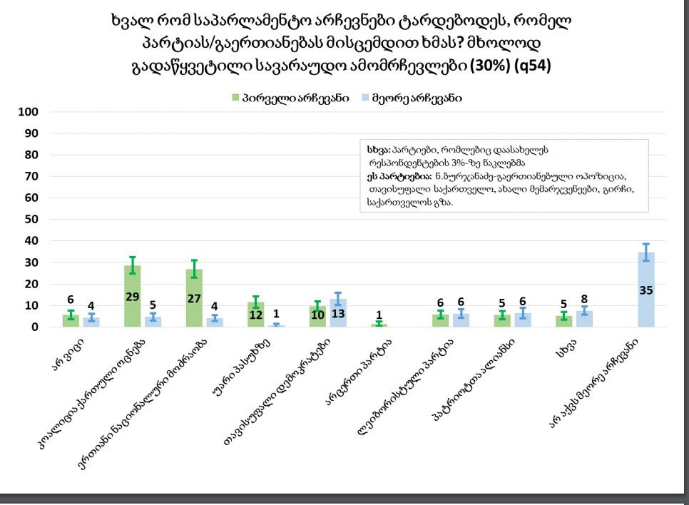 კითხვაზე, ხვალ რომ საპარლამენტო არჩევნები ტადებოდეს, რომელი პარტია გაიმარჯვებდა, 43 % გადაწყვეტილება მიღებული არ აქვს, 31 %- მიიჩნევს, რომ „ქართული ოცნება“ გაიმარჯვებდა, 11 % თვლის, რომ - „ერთიანი ნაციონალური მოძრაობა“, არც ერთი პარტია -5%, „თავისუფალი დემოკრატები“ 4 %.