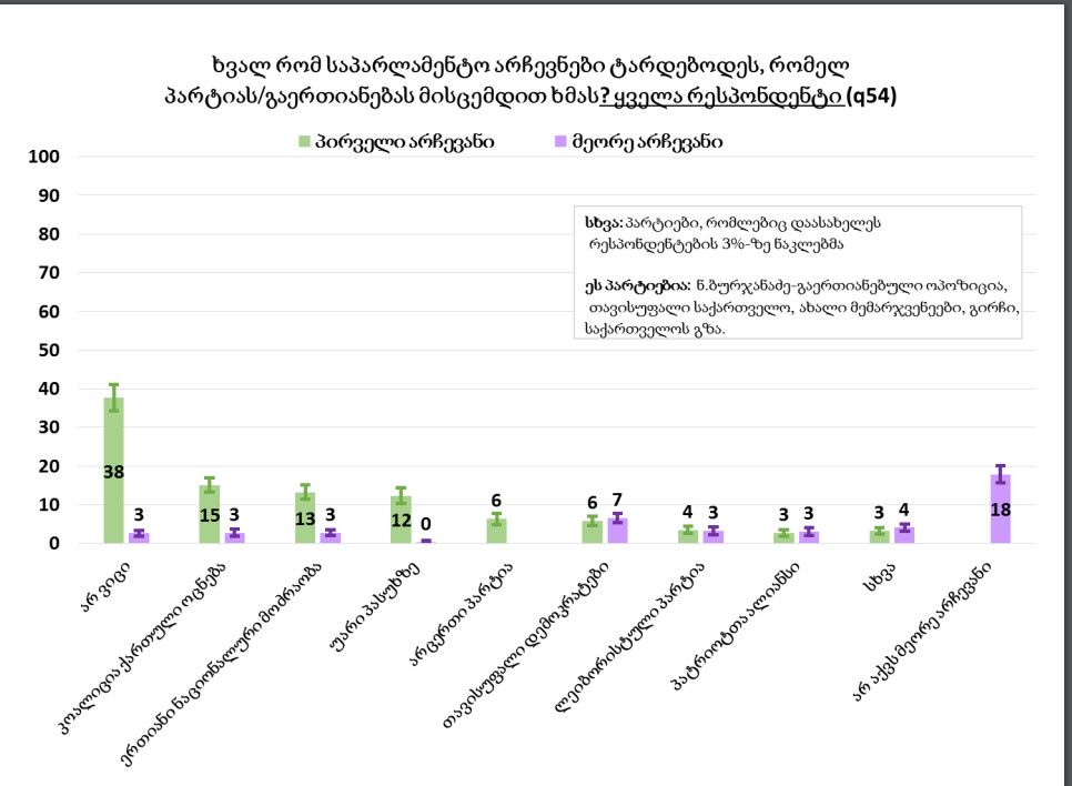 კითხვაზე, ხვალ რომ საპარლამენტო არჩევნები ტადებოდეს, რომელ პარტიას მისცემდით ხმას, ყველა რესპოდენტის პასუხის შეჯერებით მიღებული შედეგი ასეთია: არ ვიცი -38%, „ქართული ოცნება“ – 15%, - „ერთიანი ნაციონალური მოძრაობა“-13%, უარი კითხვაზე- 12 %, არც ერთი პარტია 6 %, „თავისუფალი დემოკრატები“ 6 %. „ლეიბორისტული პარტია“ 4%, „პატრიოტთა ალიანსი“ 3%, დანარჩენი პარტიები, რომელთა შორის შედის „ნ.ბურჯანაძე-გაერთიანებული ოპოზიცია“, „თავისუფალი საქართველო“, „ახალი მემარჯვენეები“, „გირჩი“, „საქართველოს გზა“-ჯამში, 3%.