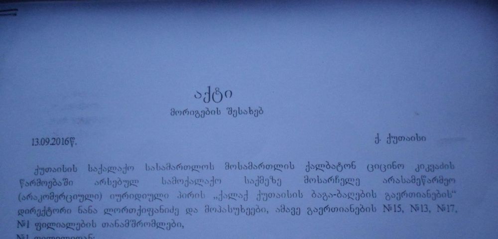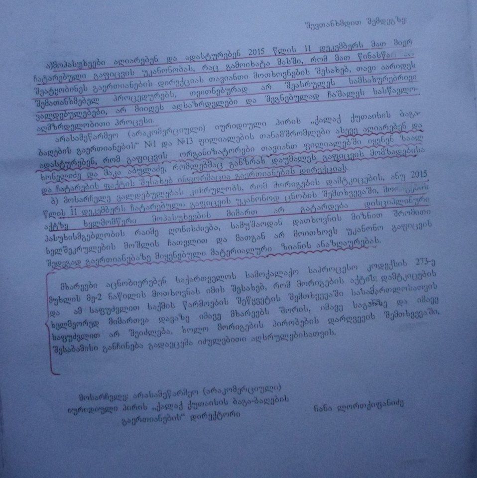 "2016 წლის 13 სექტემბრის ამ დოკუმენტით ქუთაისის ბაგა-ბაღების გაერთიანების ხელმძღვანელი აიძულებს N1 და N13 ფილიალის თანამშრომლებს - ზაალ ხონელიძე და მაკა აბულაძე გაფიცვის ორგანიზატორებად გამოაცხადონ, რის სანაცვლოდაც მათ სამსახურიდან აღარ გაათავისუფლებენ! ბაღების თანამშრომლებს აიძულებენ, ის თქვან, რაც არ მომხდარა! ეს არის პირდაპირი ზეწოლა კონკრეტულ ადამიანებზე, რითაც პროკურატურა აუცილებლად დაინტერესდება", -წერს #1 ბაგა-ბაღის ყოფილი ხელმძღვანელი ზაალ ხონელიძე სოციალურ ქსელში და შესაბამის დოკუმენტს აქვეყნებს, რასაც "ნიუპრესიც" აქვეყნებს.