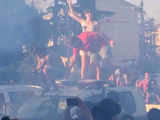 აქციის მონაწილეებმა თეთრი ფერის ბოლი გაუშვეს და პოლიციის ავტომობილებზე სტიკერები გააკრეს.