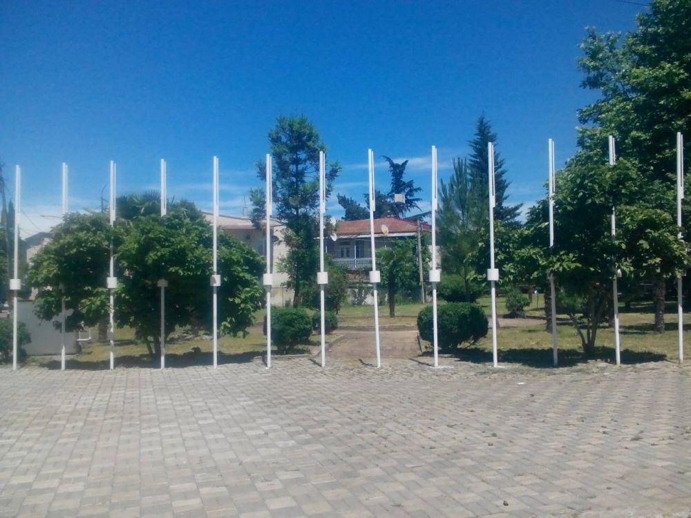 სახელმწიფო ჰიმნის ფონზე საქართველოს დროშები საზეიმოდ აღიმართება.