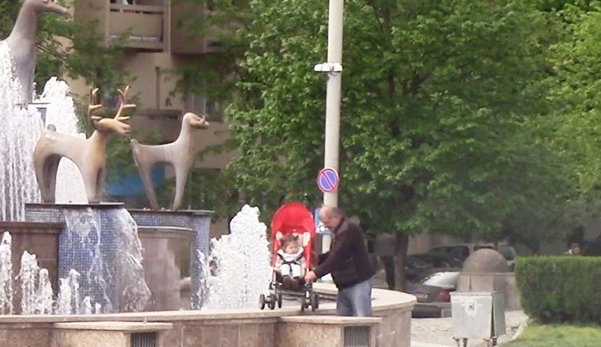 შუახნის მამაკაცი ცენტრალურ მოედანზე მდებარე "კოლხურ შადრევანზე" ბავშვს ეტლით ასეირნებს.