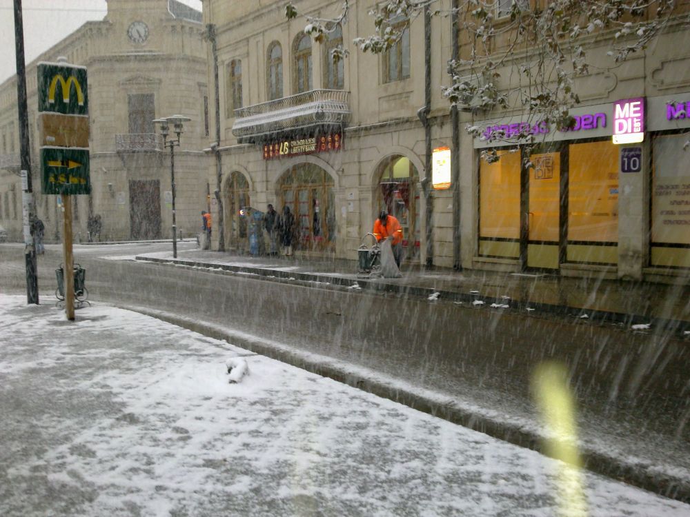 ინტენსიური თოვის მიუხედავად, დასუფთავების სამსახურის თანამშრომლები მუშაობას არ წყვეტენ.