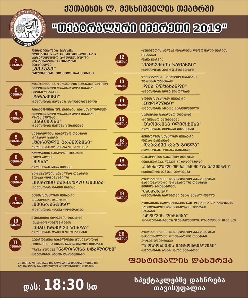 ქუთაისის მესხიშვილის თეატრში ყოველწლიური ფესტივალი იწყება. ფესტივალი "თეატრალური იმერეთი 2019" 2 ივნისს დაიწყება და 20 ივნისს დასრულდება.
