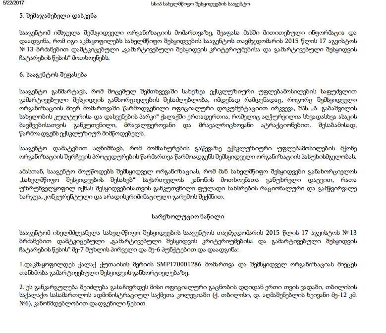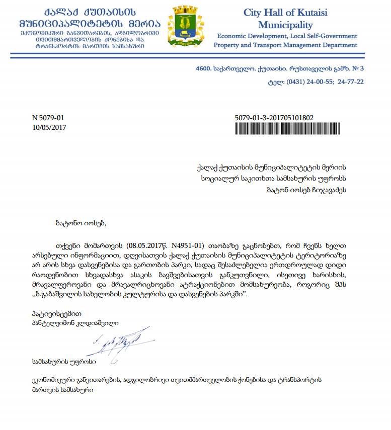 შეგახსენებთ, ქუთაისის მერიას და პარკის დირექტორს კახა კუხიანიძეს შორის გამარტივებული წესით გაფორმდა ხელშეკრულება, რის საფუძველზეც უფასო ატრაქციონების მომსახურეობისთვის 10 ათასი ლარი გამოიყო.