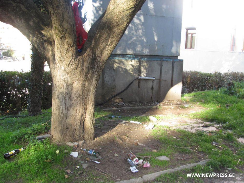 ქუთაისის ცენტრალურ ნაწილში, საათის უკან არსებული ტერიტორია თვითნებურ საპირფარეშოდაა ქცეული. უყურადღებოდ დარჩენილი სკვერი დანაგვიანებული და მოუვლელია.