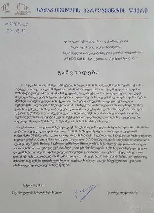 გია თევდორაძე მის მიმართ არსებული ბრალდებების გამოძიებას პროკურატურას თხოვს
