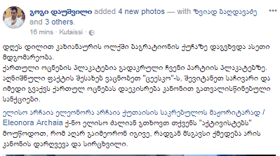 დაუშვილი "ქართული ოცნების" მაჟორიტარობის კანდიდატს ელეონორა არჩაიას მიმართავს, რომ მისმა აქტივისტებმა მსგავსი ფაქტი აღარ გაიმეორონ.