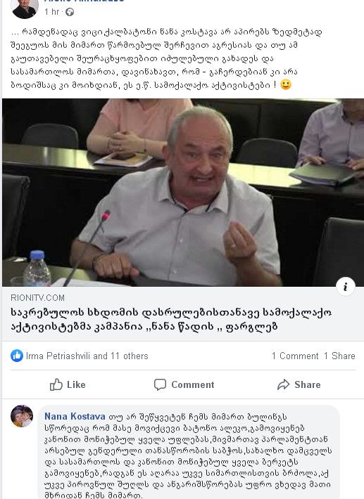 გახმაურებული პოსტის ავტორი საკრებულოს დეპუტატი ნანა კოსტავა სამოქალაქო აქტივისტებს სასამართლოში ჩივილით ემუქრება. დეპუტატი სოციალურ ქსელში კომენტარს წერს და მის წინააღმდეგ მიმდინარე პროცესებს ეხმიანება. ნანა კოსტავა საკრებულოს უმრავლესობის დეპუტატის ალეკო ახალაძის მიმართვას გამოეხმაურა.