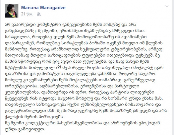 თავის მხრივ, მათ უპასუხოდ არც მანანა მანაგაძე ტოვებს. მორიგ "პოსტში" ის აცხადებს, რომ წავიდა ის დრო, როდესაც პარტიის ლიდერები წყვეტდნენ, რას იტყოდა საჯარო მოხელკე და რა სიზმარი უნდა ენახა მას.