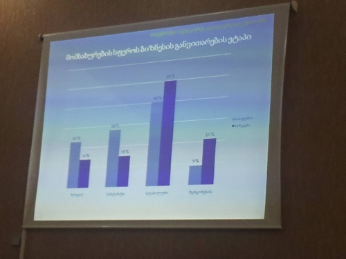 პრეზენტაციაზე წარმოადგინეს პროცენტული მაჩვენებლი, გამოკითხულთაგან თუ რამდენი სარგებლობს იჯარით და რამდენი საკუთარი ფართით. შედგები ასეთია. იჯარას იყენებს - 66%, ხოლო 34% საკუთარი ფართით სარგებლობს. რეზენტაციაზე წარმოდგენილი იყო ასევე მომავალი სამი წლის განმავლობაში აპირებენ თუ არა ბიზნეს სუბიექტები საკუთარი ბიზნესის გაფართოებას. "83-მა პროცენტმა თავი შეიკავა კითხვაზ პასუხს გაცემისგან, 1 პროცენტს არაფერი აქვს დაგეგმილი, ხოლო 16 პროცენტი გეგმავს საკუთარ სფეროში სიახლეების დაგეგმვას", - აღნიშნა პაატა კდიაშვილმა.