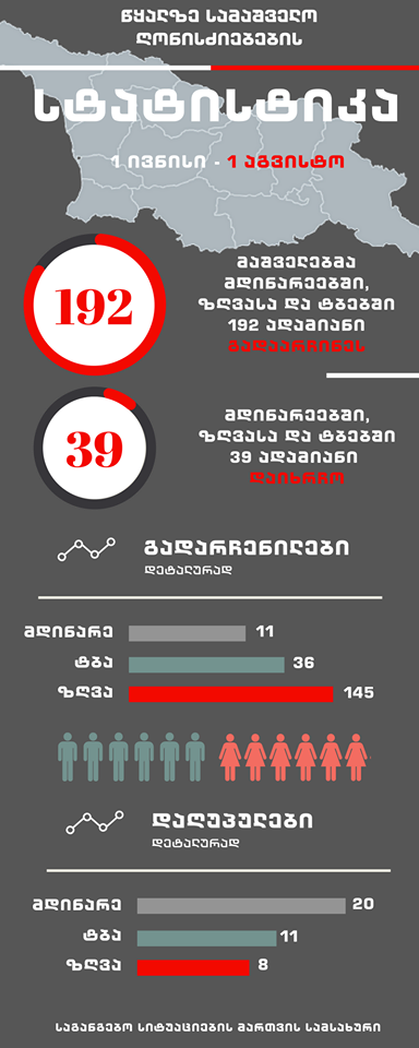 მიმდინარე წლის 1-ელი ივნისიდან 1-ელ აგვისტომდე საქართველოს მასშტაბით მაშველებმა მდინარეებში, ტბებსა და ზღვაში დარჩობას 192 ადამიანი გადაარჩინეს, თუმცა ამავე პერიოდში 39 ადამიანი დაიხრჩო, - ამის შესახებ ინფორმაციას საგანგებო სიტუაციების მართვის სამსახური აცრცელებს.