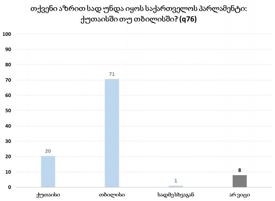 ეროვნულ დემოკრატიული ინსტიტუტის, NDI-ს მიერ ჩატარებული უახლესი კვლევის ერთ–ერთი კითხვა პარლამენტის ადგილმდებარეობას ეხებოდა, რომლის მიხედვით, გამოკითხულთა 71% თვლის, რომ პარლამენტი თბილისში უნდა იყოს. 1%–პარლამენტის ადგილად არც თბილისი და არც ქუთაისი არ მიაჩნია, მხოლოდ 20% მიიჩნევს, რომ საკანონმდებლო ორგანო ქუთაისში უნდა დარჩეს, 8%–კი კითხვაზე პასუხი არ აქვს.