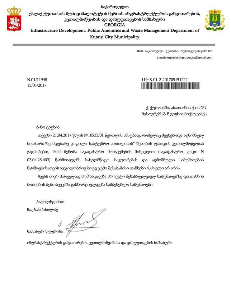 როგორც ქალაქის მერიაში აცხადებენ, შენობა სახელმწიფო საკუთრებას წარმოადგენს, თუმცა მისი ფასადის კეთილმოწყობისათვის ბიუჯეტში თანხები გათვალისწინებული არ არის. შესაბამისი პროექტის მომზადებისა და თანხების მოძიების შემდეგ მოხდება სამუშაოების განხორციელება.