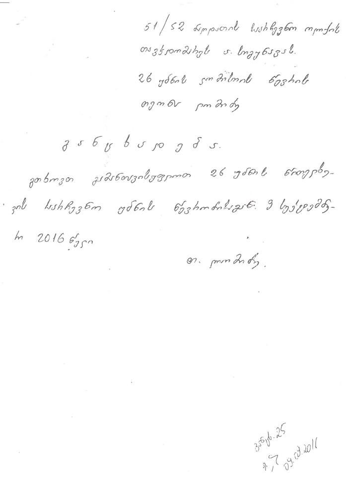 #26 საუბნო კომისიის თავმჯდომარის, ალექსანდრე კვირიკაშვილის განცხადებით, კომისიის 6 წევრი, რომლებიც ნეიტრალური ნიშნით არიან დანიშნული, შტაბში დაიბარეს და კომისიის წევრობაზე უარის თქმა მოთხოვეს.