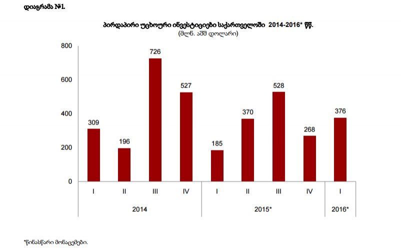წინასწარი მონაცემებით, 2016 წლის I კვარტალში საქართველოში პირდაპირი უცხოური ინვესტიციების შემომავალმა ნაკადებმა 1331 მლნ. აშშ დოლარი შეადგინა.