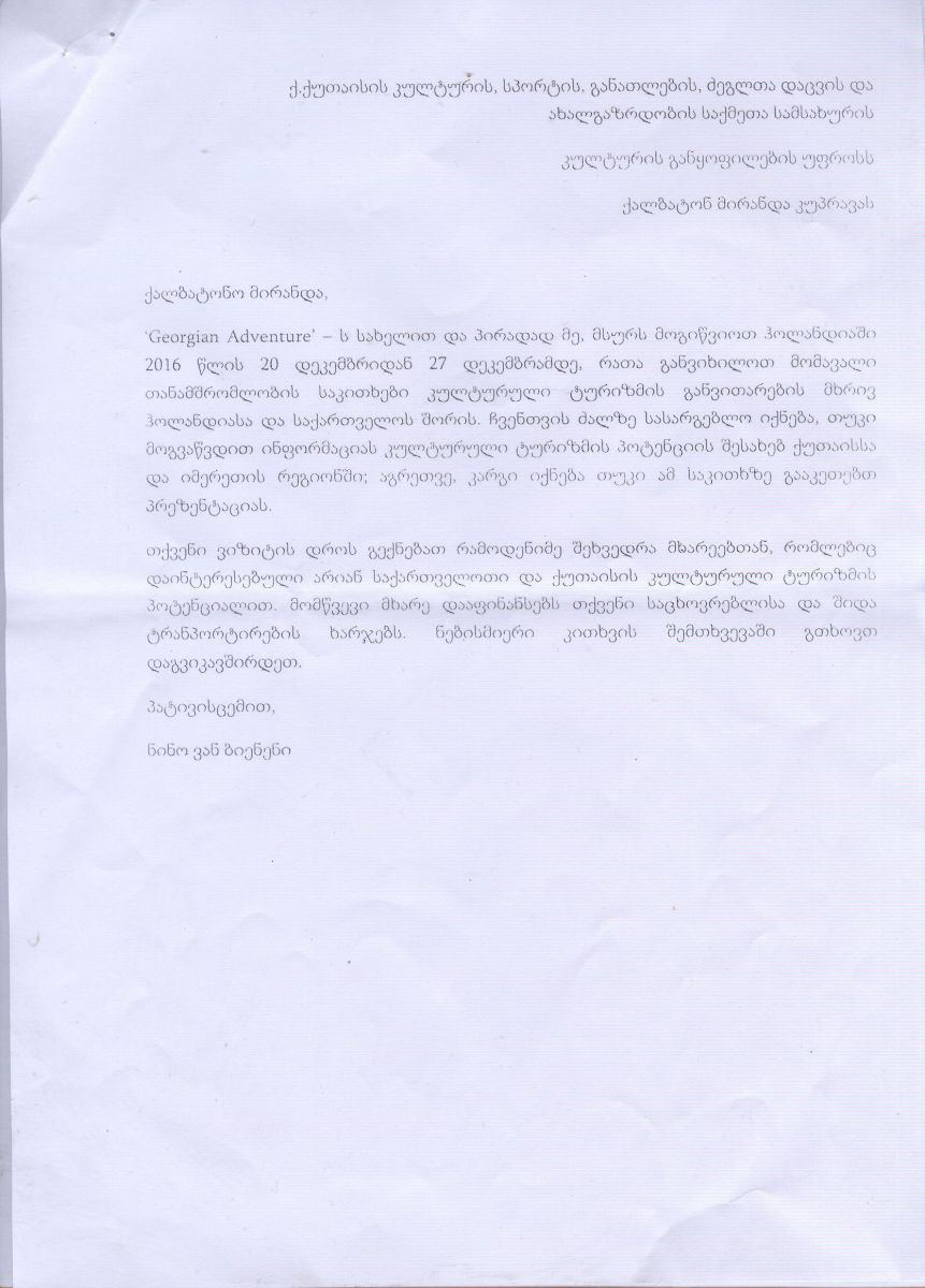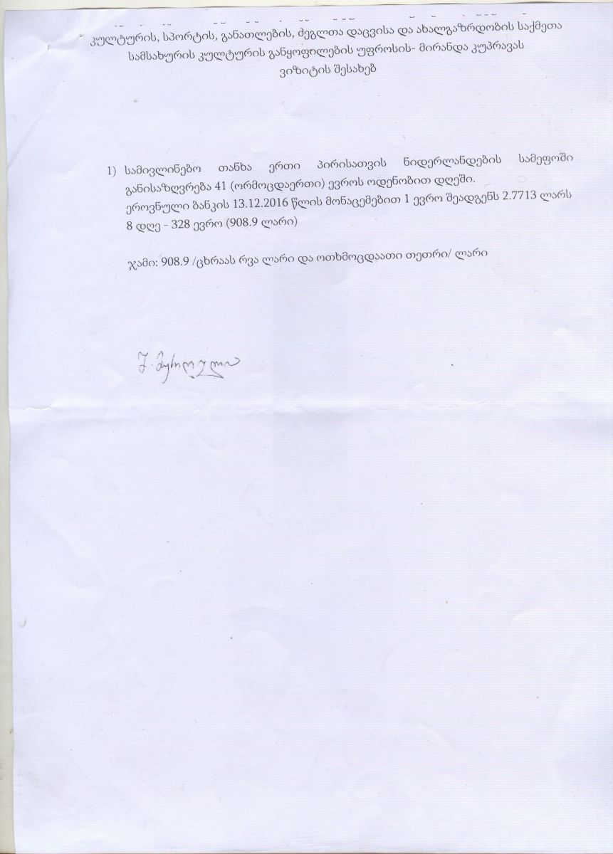 რაც შეეხება კულტურის განყოფილების უფროსის მივლინებას საახალწლო დღეებში ჰოლანდიაში, მერის განცხადებით, მირანდა კუპრავა იყო უფასო მივლინებაში და ოფიციალური მიწვევით იმყოფებოდა უცხოეთში, ყველა ხარჯი იმ ორგანიზაციამ დაფარა, რომელმაც ის მიიწვია.