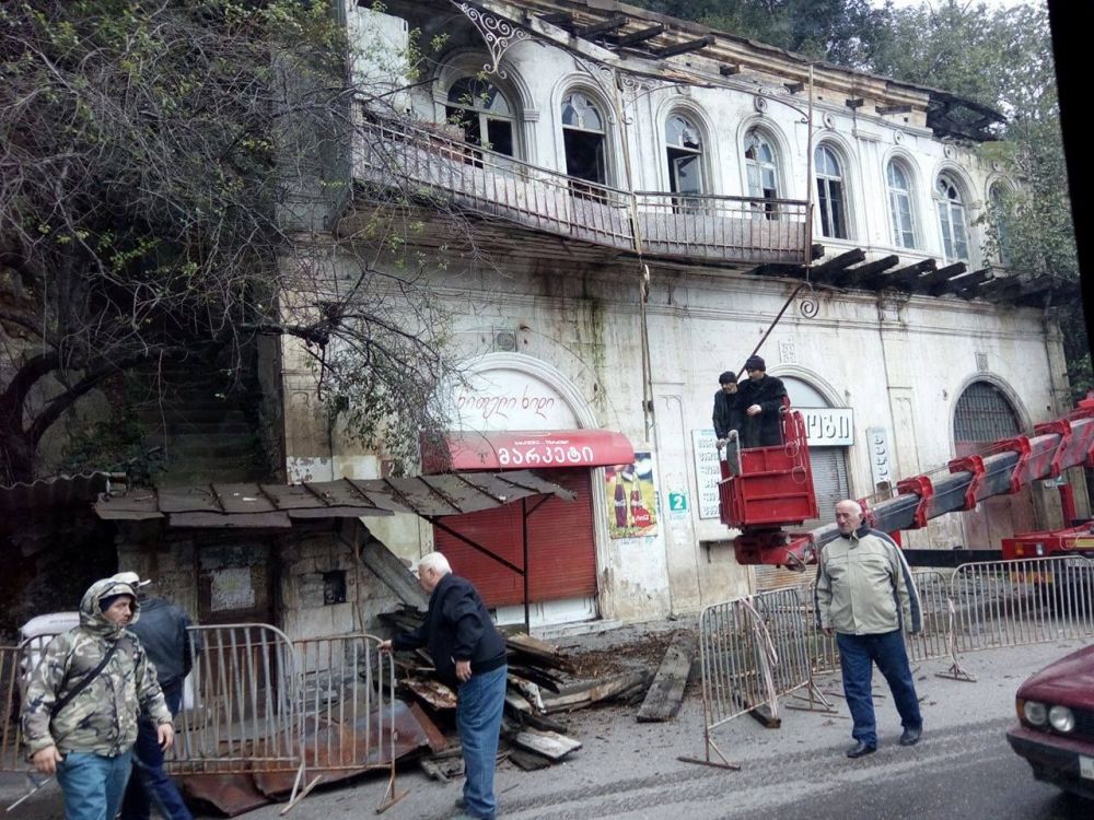 ავარიული შენობის აივნის დემონტაჟი მიმდინარეობს