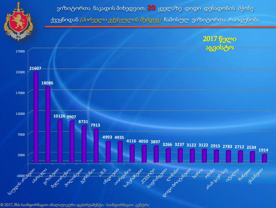 2017 წლის აგვისტოშიც ყველაზე მეტი ვიზიტი კვლავ სომხეთიდან (+12%), რუსეთიდან (+28%), აზერბაიჯანიდან (+19%), თურქეთიდან (+42%), უკრაინიდან (+4%) და ირანიდან (+85%) განხორციელდა. ასევე, პოზიტიური ტენდენცია ნარჩუნდება ევროკავშირის ქვეყნების მიმართულებიდან, საიდანაც საქართველოში ჩამოსვლების რაოდენობის ზრდის კუთხით, იანვარ-აგვისტოშიც გამოირჩნენ გერმანია, დიდი ბრიტანეთი, საფრანგეთი, პოლონეთი, ლიტვა, იტალია და საბერძნეთი (შესაბამისად 32%, 31%, 29%, 20%, 17%, 16% და 14%), ახლო აღმოსავლეთიდან - ისრაელი (40%), შუა აზიის ქვეყნებიდან - ყაზახეთი (17%), უზბეკეთი (110%). აღმოსავლეთ ევროპის ქვეყნებიდან - ბელორუსია (31%). აქვე აღსანიშნავია ამერიკის შეერთებული შტატების მოქალაქეების 27%-იანი ზრდა.