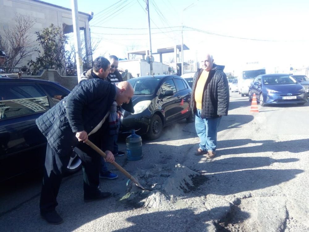 გოგი წულაიამ ქუთაისში, აღმაშენებლის გამზირზე სილა და ცემენტი მიიტანა და ორმოები ამოავსო [VIDEO]