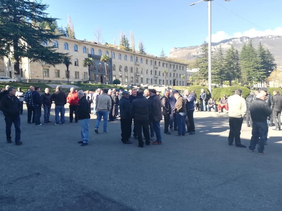 აქციის მონაწილეები ხელფასის შეწყვეტას აპროტესტებენ.