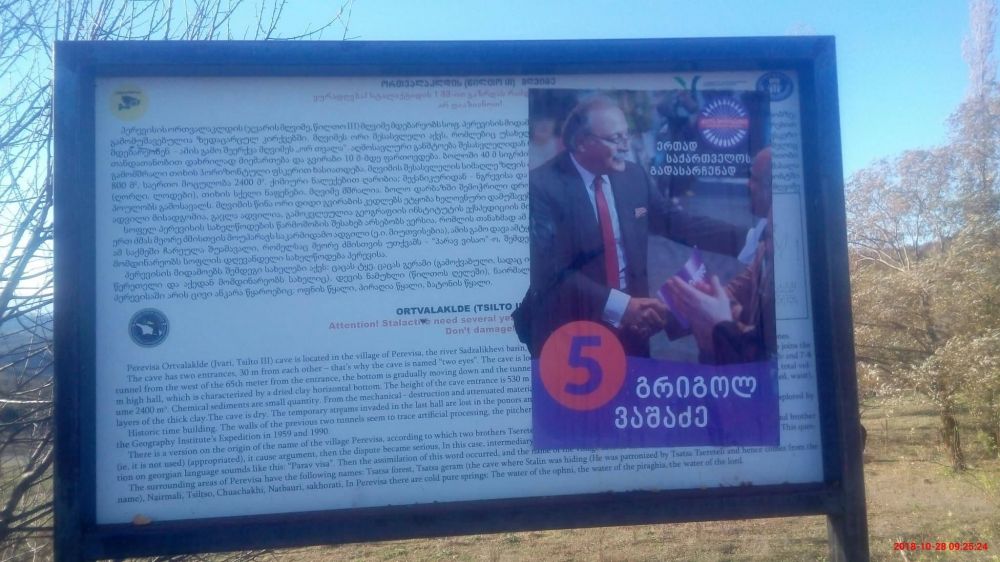 ჭიათურაში კარსტული მღვიმეების საინფორმაციო დაფაზე პრეზიდენტობის კანდიდატის ბანერი გააკრეს