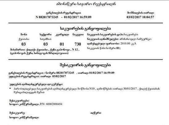 ნიკა ნარსია ტერიტორიის გასხვისების დამადასტურებელ საჯარო რეეესტრის ამონაწერს ავრცელებს.