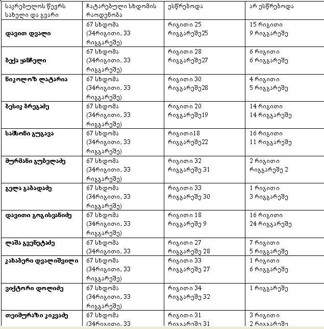 სხვა დეპუტატებს რაც შეეხება, ყველაზე კარგი მოსწრება აქვთ ვიქტორ დოლიძეს და რობიზონ წინწკალაძეს, ისინი 66 სხდომას დაესწრნენ და მხოლოდ ერთი რიგგარეშე სხდომა გააცდინეს. მათ მოყვება 64 სხდომით გალაქტიონ ტოროშელიძე.