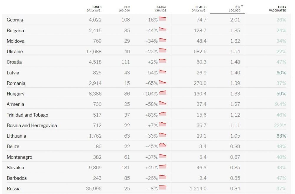 New York Times-ის მონაცემებით, ბოლო 7 დღის განმავლობაში, 100 000 მოსახლეზე კორონავირუსით სიკვდილიანობის მაჩვენებლით საქართველო მსოფლიოში პირველ ადგილზეა.