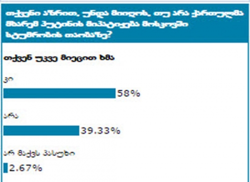 მხარემ პუტინის მიპატიჟება მოსკოვში სტუმრობის თაობაზე" , გამოკითხულთა 58 პროცენტი მიიჩნევს, რომ
