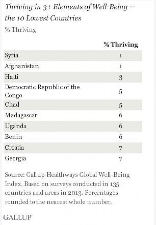 ყველაზე უბედურები კი სირიელები, ავღანელები, კონგოელები, მადაგასკარელები, უგანდელები, ხორვატები და ქართველები არიან.