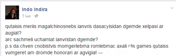 მომღერალი ინდირა ჯგერნაია საკუთარი ფეისბუქის გვერდზე პოსტს აქვეყნებს, სადაც ქუთაისის მერიის მაღალჩინოსნებს მიმართავს. როგორც ,,ნიუპრესისთვის" გახდა ცნობილი, აღნიშნული პოსტის დაწერისკენ მომღერალს შექმნილმა ვითარებამ უბიძგა. ჯგერნაიას ინფორმაციით, მომღერლებს, რომლებიც ახალი წლის ღამეს ქალაქის ცენტრალურ მოედანზე, სცენაზე იდგნენ, ჰონორარი ამ დრომდე არ მიუღიათ.