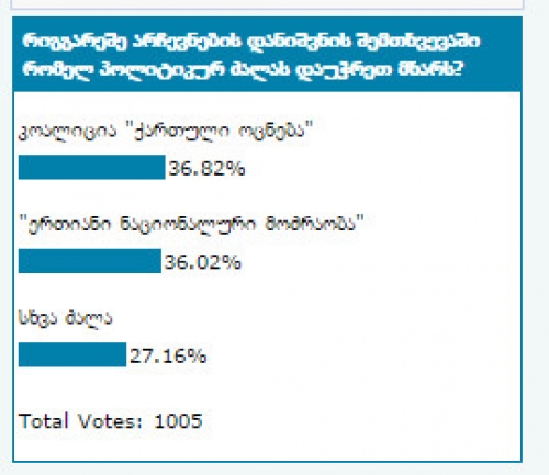 საინფორმაციო სააგენტო ,,ნიუპრესის" 1000 გამოკითხული ადამიანიდან კითხვაზე: რიგგარეშე არჩევნების დანიშვნის შემთხვევაში, რომელ პოლიტიკურ ძალას დაუჭერთ მხარს? შედეგები შემდეგნაირად გადანაწილდა: გამოკითხვის მიხედვით, კოალიცია ,,ქართულმა ოცნებამ" და ძირითადმა ოპოზიციურმა ძალამ ,,ნაციონალურმა მოძრაობამ" თითქმის თანაბარი შედეგები აჩვენეს. პროცენტები შემდეგნაირად გადანაწილდა: კოალიცია ,,ქართული ოცნება" - 36,82%, ,,ნაციონალური მოძრაობა" - 36,02%, ხოლო ,,სხვა ძალას" - 27,16% ერგო.