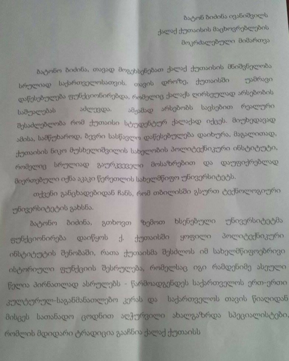 გოგი წულაია ქუთაისში ტექნოლოგიური უნივერსიტეტის გახსნას მოითხოვს. პარტია "თავისუფალი საქართველოს" იმერეთის ორგანიზაციის თავმჯდომარე ბიძინა ივანიშვილს რიგითი მოქალაქის სტატუსით მიმართვს. მისი თქმით, ქუთაისს აქვს რეალური შესაძლებლობა იქცეს საუნივერსიტეტო ქალაქად. ტექნოლოგიური უნივერსიტეტის ადგილად კი ყოფილ პრემიერს წულაია ქუთაისის ყოფილი პოლიტექნიკური უნივერსიტეტის შენობას სთავაზობს, რომელიც ამჟამად წერეთლის სახელმწიფო უნივერსიტეტს ეკუთვნის.