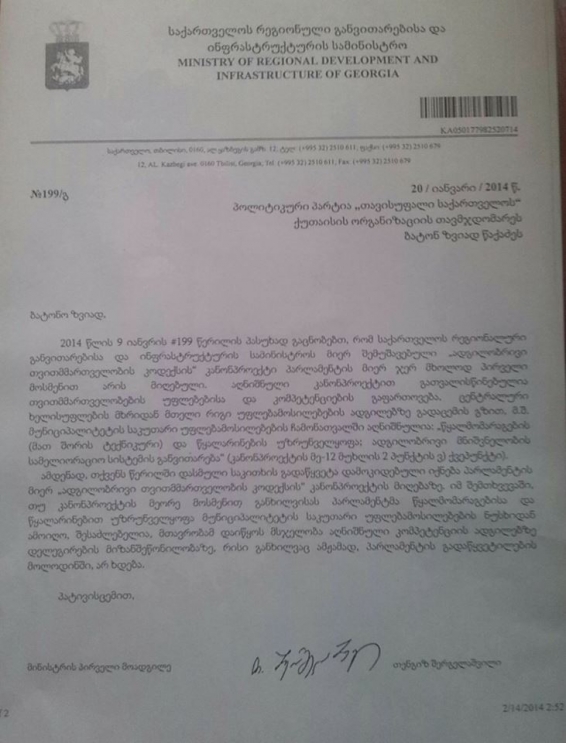 მისი თქმით, მან წერილობით სამინისტროსაც მიმართა, საიდანაც ასეთი პასუხი მიიღო: "თქვენს წერილში დასმული საკითხის გადაწყვეტა დამოკიდებული იქნება პარლამენტის მიერ "ადგილობრივი თვითმმათველობის კოდექსის" კანონპროექტის მიღებაზე. იმ შემთხვევაში თუ კანონპროექტის მეორე მოსმენით განხილვისას პარლამენტმა წყალმომარაგებისა და წყალარინებით უზრუნველყოფა მუნიციპალიტეტის საკუთარი უფლებამოსილების ნუსხიდან ამოიღო, შესაძლებელია, მთავრობამ დაიწყოს მსჯელობა აღნიშნული კომპეტენციების ადგილებზე დელეგირების მიზანშეწონილობაზე, რისი განხილვაც ამჟამად, პარლამენტის გადაწყვეტილების მოლოდინში არ ხდება",- ნათქვამია წერილში რომელიც პარტიის ლიდემა საქართველოს რეგიონალური განვითარებისა და ინფრასტრუქტურის სამინისტროსგან მიიღო. გოგი წულაია იმერეთის გუბერნატორს გივი ჭიჭინაძესაც მიმართავს, რომ დაატყოს ქალაქს ხელი, რადგან მისი თქმით ქუთაისის მერია მხოლოდ ავტომობილების შეძენითაა დაკავებული.
