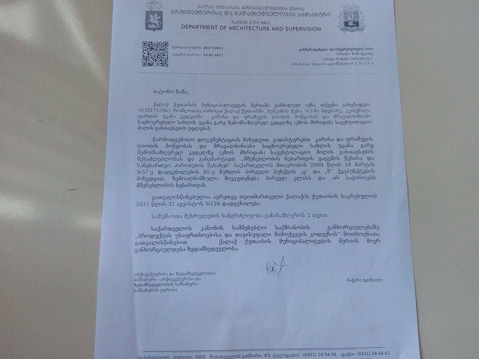 მან უკვე მიმართა პრემიერ-მინისტრს, რომელმაც განცხადება მერიის სახელზე გადმოამისამართა, ასევე მიმართა პროკურატურას და მოითხოვს კაფეს მშენებლობის შეჩერებას.