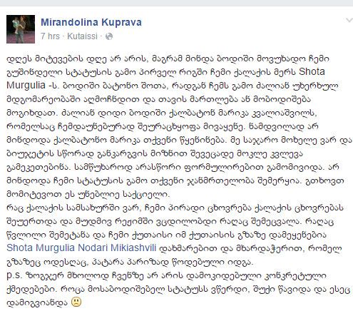 "დღეს მიტევების დღე არ არის, მაგრამ მინდა ბოდიში მოვუხადო ჩემი გუშინდელი სტატუსის გამო პირველ რიგში ჩემი ქალაქის მერს შოთა მურღულიას. ბოდიში ბატონო შოთა, რადგან ჩემს გამო ძალიან უხერხულ მდგომარეობაში აღმოჩნდით და თავის მართლება, ან მობოდიშება მოგიხდათ. ძალიან დიდი ბოდიში ქალბატონ მარიკა კვალიაშვილს, რომელსაც ჩემდაუნებურად შეურაცხყოფა მივაყენე. ნამდვილად არ მინდოდა ქალბატონო მარიკა, თქვენი წყენინება. მე საჯარო მოხელე ვარ და ბიუჯეტის სწორად განკარგვის მიზნით შევეცადე მოკლე კვლევა გამეკეთებინა. სამწუხაროდ, არასწორი ფორმულირებით გამომივიდა. არ მინდოდა ჩემი სტატუსის გამო თქვენი ჯანმრთელობა შემერყია. გთხოვთ, მომიტევოთ ეს უნებლიე საქციელი. რაც ქალაქის სამსახურში ვარ, ჩემი პირადი ცხოვრება ქალაქის ცხოვრებას შეუერთდა და მუდმივ რეჟიმში ვცდილობდი, რაღაც შემეცვალა. რაღაც წვლილი შემეტანა და ჩემი ქუთაისი იმ ქუთაისის გზაზე დამეყენებია შოთა მურღულიას და ნოდარ მიქიაშვილის დახმარებით და მხარდაჭერით, რომელ გზაზეც ოდესღაც, პატარა პარიზად წოდებული იდგა. p.s. ზოგჯერ მხოლოდ ჩვენზე არ არის დამოკიდებული კონკრეტული ქმედებები. როცა მოსაბოდიშებელ სტატუსს ვწერდი, შუქი წავიდა და ესეც დამიგვიანდა"–წერს კუპრავა.