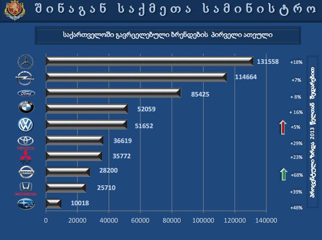 ზრდის მაჩვენებელმა 2014 წელს 9.7% შეადგინა. ავტოპარკის მნიშვნელოვანი ნაწილი (90%) 2004 წლამდეა წარმოებული. 3 წლამდე ასაკის ავტოსატრანსპორტო საშუალებები ავტოპარკის მხოლოდ 2%-ს შეადგენს. საქართველოში ყველაზე მეტად გავრცელებულია MERCEDES BENC-ის და OPEL-ის მარკის ავტომანქანები. 2014 წელს მნიშვნელოვნად გაიზარდა NISSAN-ის და SUBARU-ს რაოდენობები. მათი ზრდის კოეფიციენტი 2014 წელს შესაბამისად არის 1,7 და 1,5. მოდელებიდან კვლავ ლიდერობს OPEL Astra და OPEL Vectra, რომლებსაც მოსდევს MERCEDES BENZ E და MERCEDES BENZ C .