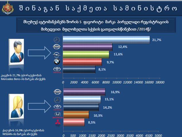 პირველადი რეგისტრაციების მიხედვით მსუბუქი ავტომანქანების წილი 60%-ია, ხოლო მსუბუქი მაღალი გამავლობის - 32%. როგორც პირველადი რეგისტრაციებიდან ირკვევა, კაცები უპირატესობას MERCEDES–ის მარკის ავტომანქანებს ანიჭებენ, ხოლო ქალები - NISSAN-ს. მოდელებიდან მამკაცებში პირველ ადგილზეა MERCEDES BENZE, ხოლო ქალებში ლიდერობს HONDA FIT. 3 წლამდე ასაკის ა/მ-ებიდან 2014 წელს ყველაზე მოთხოვნადი იყო ტოიოტა (1209), რომელსაც მოსდევს ჰუნდაი (613), ფორდი (349), კია (294), შკოდა (271) და ა.შ.