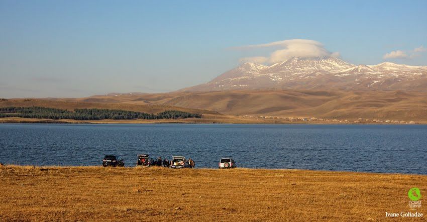 ჯავახეთი, საქართველოს ყველაზე დიდი ტბა. უკანა ფონზე მისტიური სამსარის მთები ჩანს.
