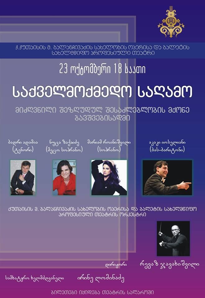 ქუთაისის მელიტონ ბალანჩივაძის სახელობის ოპერისა და ბალეტის სახელმწიფო თეატრში შეზღუდული შესაძლებლობების მქონე ბავშვებისადმი მიძღვნილი საქველმოქმედო კონცერტი გაიმართება. მასში მონაწილეობას მიიღებენ: ბადრი ადამია (ტენორი), ნუცა ზაქაიძე (მეცო სოპრანო), მარიამ როინიშვილი (სოპრანო), აკაკი იოსელიანი (ბას-ბარიტონი). კონცერზე დაუკრავს ქუთაისის მელიტონ ბალანჩივაძის სახელობის ოპერისა და ბალეტის სახელმწიფო თეატრის ორკესტრი. საღამოს უდირიჟორებს რევაზ ჯავახიშვილი. თეატრის სამხატვრო ხელმძღვანელია ირინე ლომინაძე.