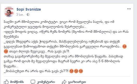 "ბაღში ვარ მშობელთა კომიტეტი. დღეს მოდის ვიღაც, იწერს ჩემს ნომერს (მგონია, რომ მშობელია) და აი რას მეუბნება - დღეს შეხვედრა აქვს ჭიღვარიას, მასწავლებლებიც იქნებიან და თქვენ გევალებათ წამოიყვანოთ თქვენი მშობლების გარკვეული რაოდენობა.. თავი ძლივს შევიკავე.. რას გავს ეს?! თანაც გავამეორებინე, მე მევალება თუ არა მშობლების წაყვანა? პასუხად გამცა, რომ დიახ, მე მევალებოდა, მაგრამ ბევრი კი არა, ასე 5 - 6 მშობლის წაყვანა.. მიპასუხეთ, რა არის და რას გავს ეს??!"- წერს სოფო სვანიძე, რომელიც, როგორც სოციალურ ქსელში მის მიერ განთავსებული ინფორმაციით ირკვევა, "ნაციონალური მოძრაობის" მხარდამჭერი და საკრებულოში ამ პარტიის მაჟორიტარი დეპუტატობის კანდიდატის გაგა მანაგაძის მეუღლეა.