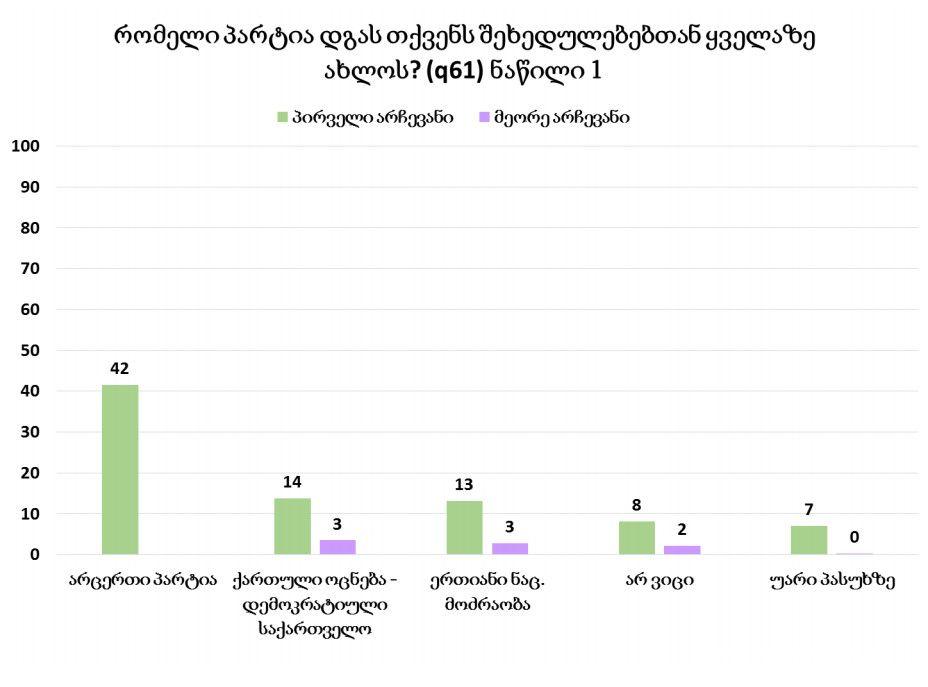 კვლევამ ასევე აჩვენა, რომ საქართველოს მოსახლეობის 18%-ის თანახმად, "ქართული ოცნება" მათ შეხედულებებთან ყველაზე ახლოს მდგომი პარტიაა, 14%–თვის ასეთი "ერთიანი ნაციონალური მოძრაობაა", 9%-თვის კი - "ირაკლი ალასანია-თავისუფალი დემოკრატები". იმ ადამიანების რიცხვი, რომლებიც ამბობენ, რომ არცერთი პარტია არ დგას მათ შეხედულებებთან ახლოს, აგვისტოს გამოკითხვის შემდეგ, 42%-დან 30%- მდე შემცირდა.